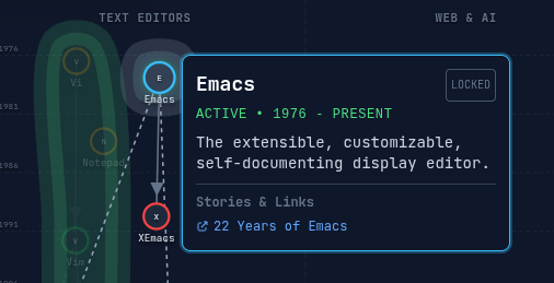 Each node can also be clicked, this will lock the popup and will allow you to click the link(s) in the popup. I want to collect some personal stories for different editors, or perhaps link to some form of codified history on the particular editor.