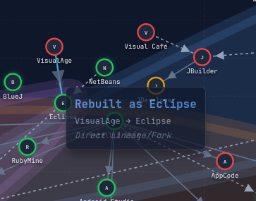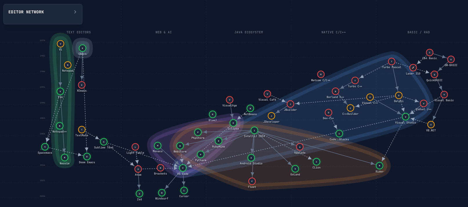 I started with my trusty Emacs and its friend (neo)vi(m). Alongside staples such as IntelliJ IDEA and VS Code. Using some LLM magic and Wikipedia knowledge I started assembling lineage of the various products and influence of different editors on eachother. For instance, did you know that Lighttable introduced some of the web based editing concepts we now see in Electron? Or that Visual Age was rebuilt into Eclipse, from which modern day editors take a lot of lessons?